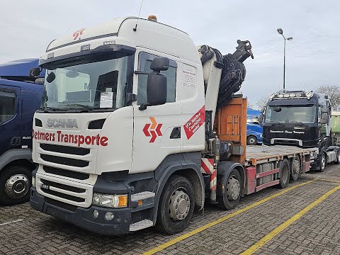 Number of axles: 4, Configuration: 8x2, Own weight: 18740 kg, Gross vehicle weight: 35000 kg, Total fuel capacity: 400 litre, Trailer coupling, Kingpin size: 40 DIN, fifth-wheel: Fixed, Diff. locks: 1, Central lubrication, Suspension type: air suspension, Cabin type: Sleeping cabin, Cruise control, Tacho, Digital tachograph, Airconditioning, Parking heater, Electric windows, Electric mirrors, Radio/cassette, GPS navigation, Color: white, Heated mirrors, Lighting type: Halogen lamps, Seat heating, Bluetooth, Flashing lights, Engine capacity: 360 Kw (483 Hp), Fuel type: diesel, Euro: 6, Gearbox kind: Opti-cruise, Gearbox make: Scania, Number of Gears: 12, Add. break system, Retarder make: Scania, Power steering, ABS, ASR, PTO, PTO type: 1, Starter battery, Twistlocks: 1x20, Pump, Central locking, Seats configuration: 1+1, Seat cover: cloth, Chair adjustment: Manually, Crane, Crane make: HMF 6020, Year crane: 2015, Capacity crane: 60000, Maximum load: ?, Number of supports: 4, Crane position: Behind the cabin, Hydraulic extendable: 6 times, Hook